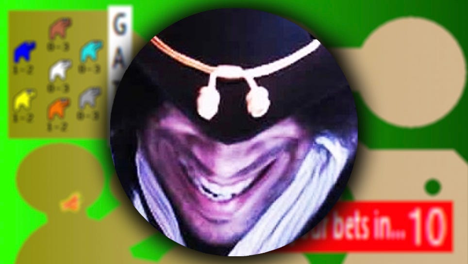 I think narrative games are kind of stupid in a lot of ways, and what's cool with the horse races is that the narrative is purely emergent. It's all just what the players are doing, how they're interacting with each other. People are coming up with these stories about these bouncing balls, which I think is so sick.